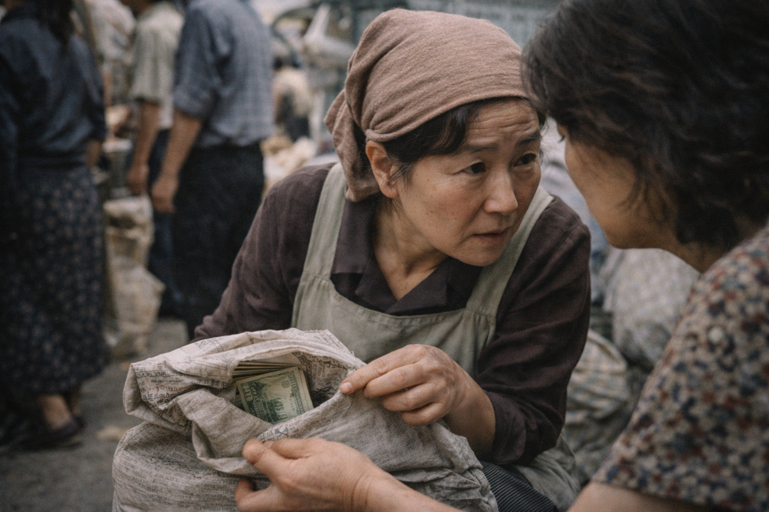 2. 쌀값보다 무서운 환율, 그 안의 인정야담 여기서 우리는 생존을 위해 수학자가 되어버린 평양 어머니들의 애틋한 '인정야담'을 보게 됩니다. 딸의 혼수를 장만하기 위해, 혹은 아들의 대학 등록금을 마련하기 위해 시장에서 번 푼돈을 아끼고 아껴 달러로 바꿔두는 것이 평양 사람들의 가장 확실한 재테크입니다. 자국 화폐의 가치가 떨어지는 것을 지켜보며 밤잠을 설치던 어머니들이, 장마당 환율이 조금이라도 올랐을 때 가슴을 쓸어내리며 달러 한 장을 품에 꼭 쥐는 모습은 참으로 씁쓸하면서도 강인한 생명력을 느끼게 합니다. "내 돈은 못 믿어도 달러는 믿는다"는 웃지 못할 농담 속에는, 무너진 국가 경제 시스템 속에서 스스로의 삶을 지켜내야 하는 평범한 사람들의 처절한 노력이 담겨 있습니다.