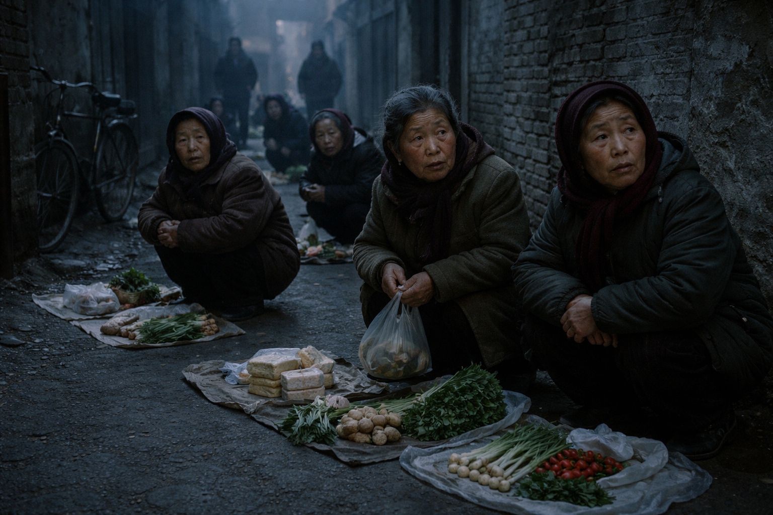 Located in narrow alleys or near apartment complexes, these markets offer fresher produce and lower prices than the official ones. Sellers are often elderly women or laid-off workers carrying their goods in simple basins or backpacks. The "Injung-yadam" here is the silent code of conduct between the sellers and the local residents. Neighbors keep a lookout for inspectors, and transactions are done in hushed whispers to avoid detection. It’s a high-stakes game of hide-and-seek where a bag of potatoes or a bunch of spring greens can mean the difference between hunger and a warm meal. On my YouTube channel, "Pyongyang-daek Okryu-unni," I’ve shared the adrenaline-filled footage of these markets vanishing in seconds and the resilient spirits of the "Grasshopper" mothers. Join me as we explore the shadows of Pyongyang's economy.